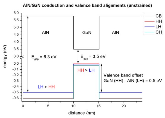 Figure 2.5.173 shows the conduction and valence band edge alignment in AlN/GaN structures (unstrained). In AlN, the light hole (LH) is the highest valence band whereas in GaN, this is the heavy hole (HH). We assumed a valence band offset of VBO = 0.5 eV, the conduction band offset is much larger (CBO = 2.3 eV). All material parameters are based on [Andreev2000] although meanwhile better parameters are available.