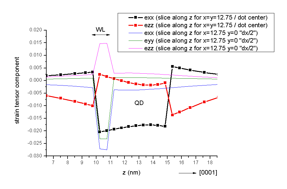 The strain tensor components of a line through the center of the quantum dot along the z axis are shown in Figure 2.5.179. This figure is related to Fig. 2 (a) in [Andreev2000].
