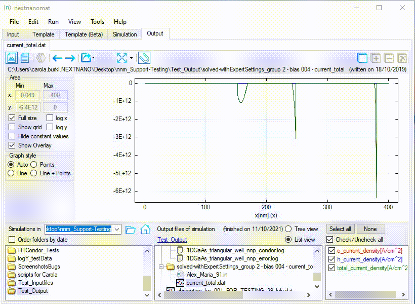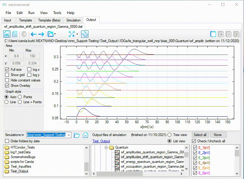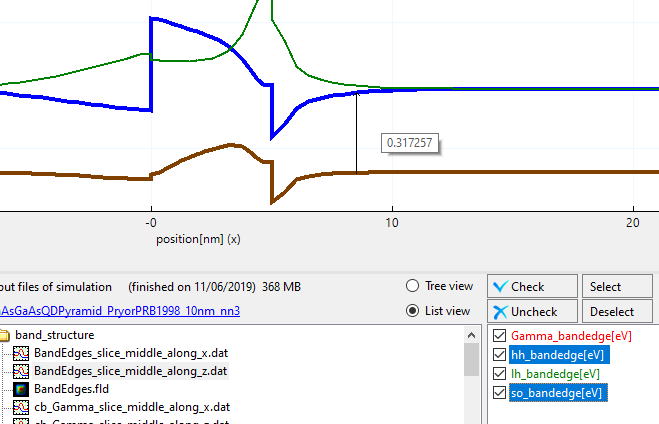 This feature hides any parts of the curves where the value does not change within 5 grid points (two to the left and right). Its purpose is for visualizing wave functions and probability densities on top of band edges. The constant part which represents the energy level will be hidden. This allows to focus on the changing parts as well as for the underlying band edge to be seen. The influence of this feature can be seen in Figure 1.1.23 and Figure 1.1.24.