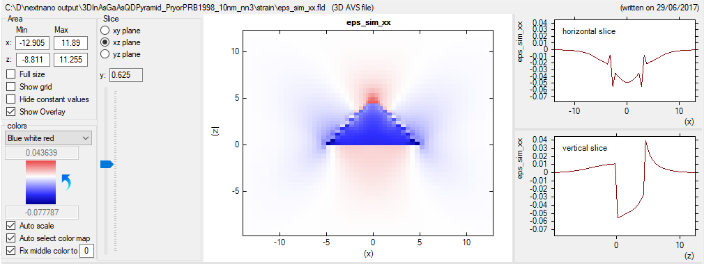 Real three-dimensional plots are not supported by nextnanomat. Instead 2D planes of the 3D data are visualized through heat maps, same as for 2D data. An additional panel allows the selection of the displayed plane (xy, xz or yz) and the position of the slice. This panel can be seen in Figure 1.1.31. If three-dimensional visualization is aimed for, we recommend exporting data to ParaView.