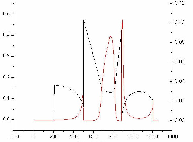 The black curve shows conduction band 1 and the red curve shows the electron density. Clearly, one can see that there are two triangular "bags" in the conduction band at GaAs/AlGaAs interfaces. If these bags lie below the Fermi energy, 2DEGs (two dimensional electron gases) can be formed. By variation of the doping concentration one should be able to generate zero, one or two 2DEGs. By increasing the doping concentration one should observe an increase in the number of electrons in the left GaAs/AlGaAs interface, which is not desired. The task is to avoid this and to get an 2DEG on the right side by choosing an appropriate doping profile.